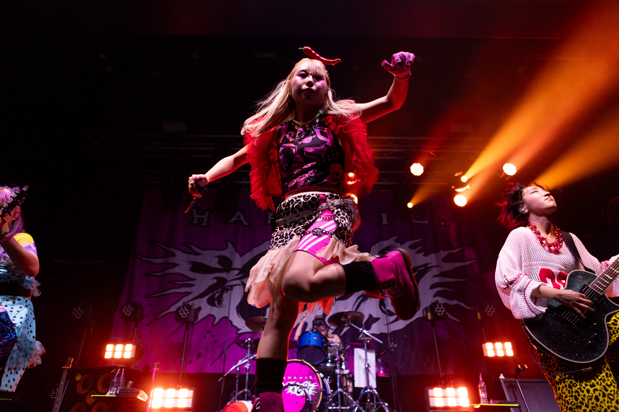 Bursting onto the stage with a riotous, chaotic energy, Hanabie. systematically tore Academy 2 apart on the second night of their UK and European tour. Straight from the vibrant streets of Tokyo, this all-female four-piece launched into ‘Warning!!’ with the heart-stopping bass, electronic noises and feral screams typical of their self-described genre Harajuku-Core, which draws influences from metal, Japanese pop culture and hardcore punk.